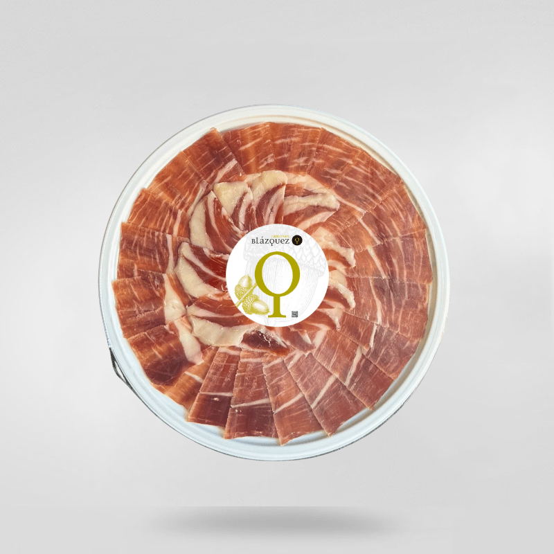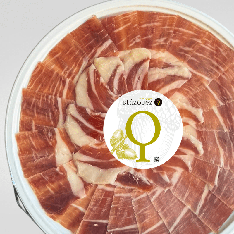 Jamón de bellota 100% ibérico envasado en atmósfera protectora y lonchedo a mano, mantiene las propiedades de olor, sabor, color y textura, conseguimos que las lonchas se despeguen con facilidad, facilitando el emplatado y mostramos el producto vistosamente.